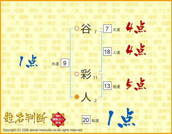 あなたの人生を表す1番重要な運勢です。生涯を通じて影響する総合運となり、主に50歳以降の晩年期に影響を及ぼします。苗字と名前の合計画数。