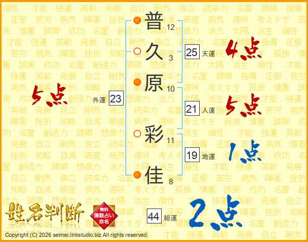 普(12画)久(3画)原(10画) 彩(11画)佳(8画)