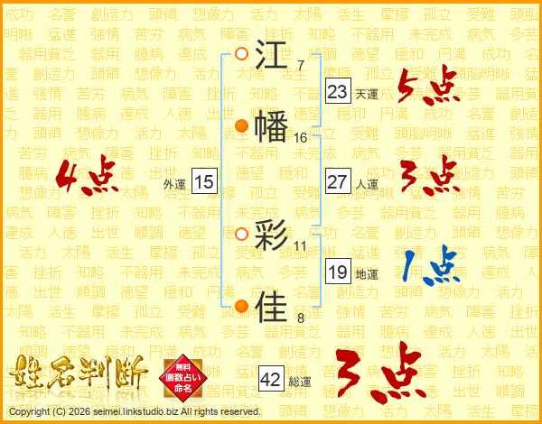 江(7画)幡(16画) 彩(11画)佳(8画)