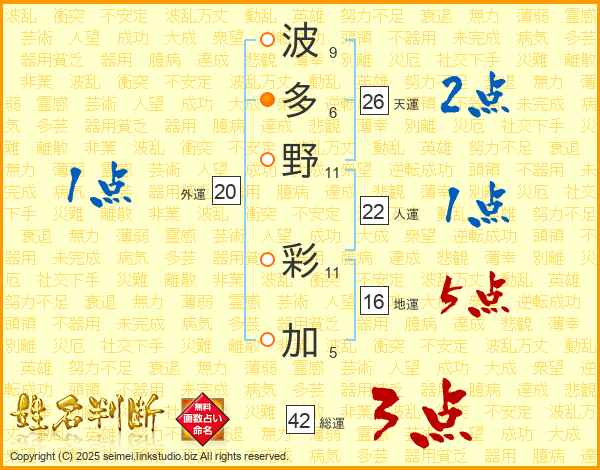 波(9画)多(6画)野(11画) 彩(11画)加(5画)