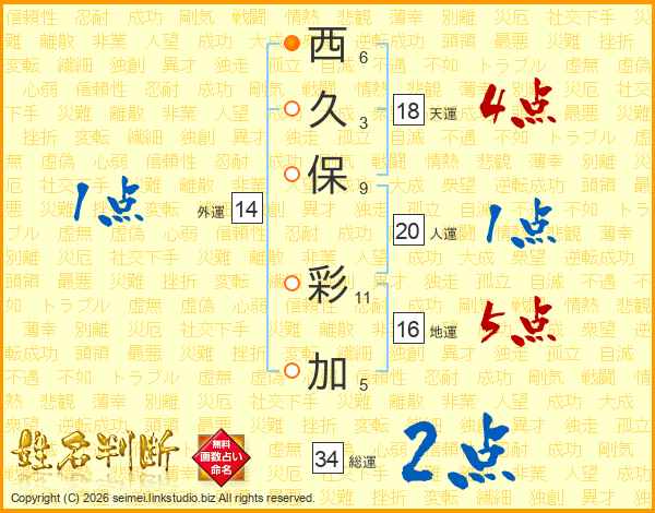 西(6画)久(3画)保(9画) 彩(11画)加(5画)