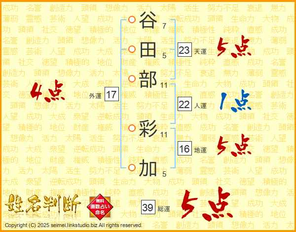 谷(7画)田(5画)部(11画) 彩(11画)加(5画)