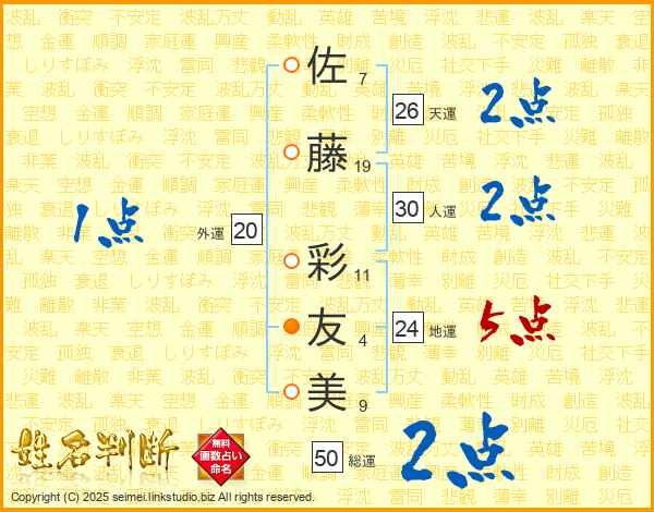 佐(7画)藤(19画) 彩(11画)友(4画)美(9画)