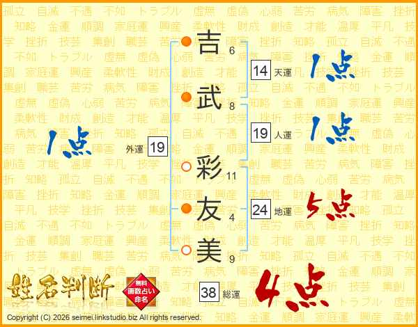 吉(6画)武(8画) 彩(11画)友(4画)美(9画)