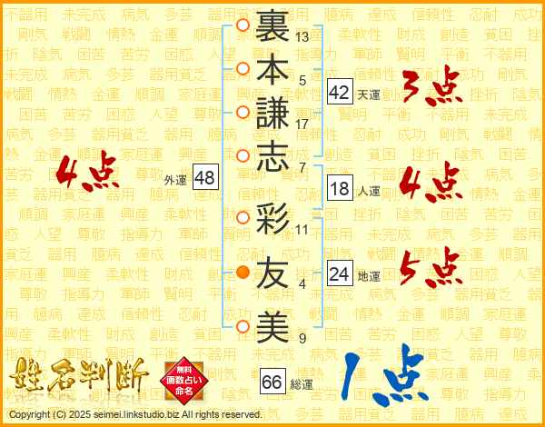 裏(13画)本(5画)謙(17画)志(7画) 彩(11画)友(4画)美(9画)