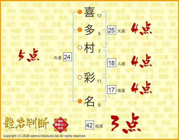 喜(12画)多(6画)村(7画) 彩(11画)名(6画)