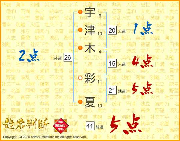 宇(6画)津(10画)木(4画) 彩(11画)夏(10画)