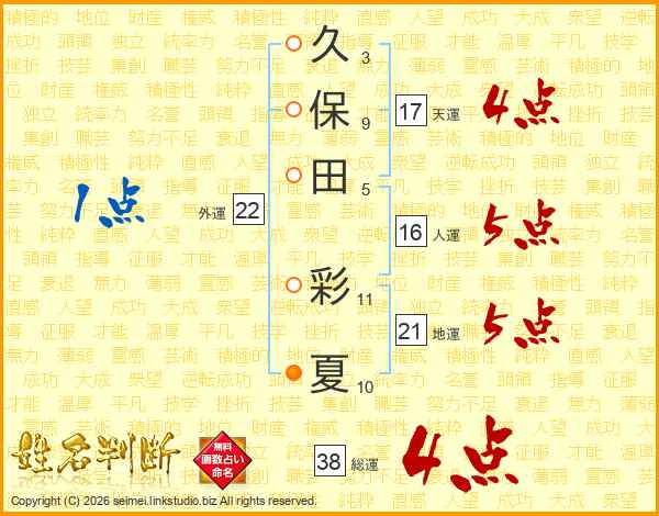 久(3画)保(9画)田(5画) 彩(11画)夏(10画)
