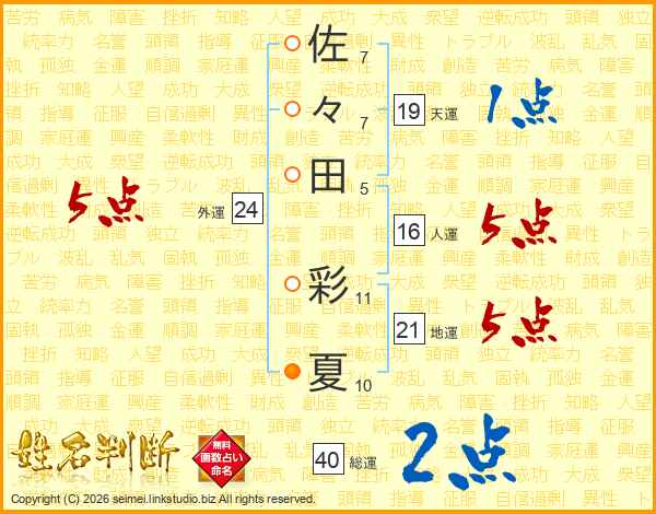 佐(7画)々(7画)田(5画) 彩(11画)夏(10画)