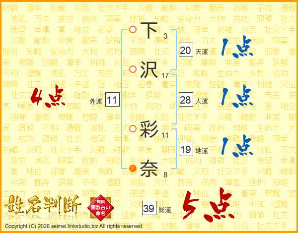 下(3画)沢(17画) 彩(11画)奈(8画)