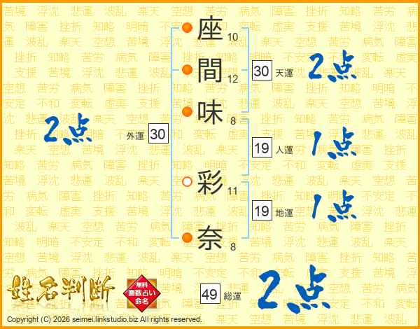 座(10画)間(12画)味(8画) 彩(11画)奈(8画)