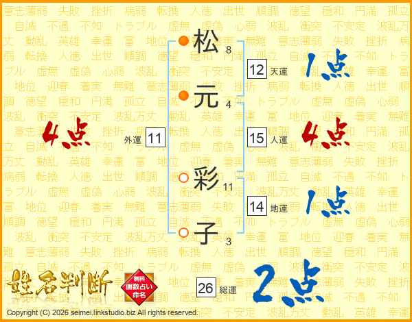 あなたの人生を表す1番重要な運勢です。生涯を通じて影響する総合運となり、主に50歳以降の晩年期に影響を及ぼします。苗字と名前の合計画数。