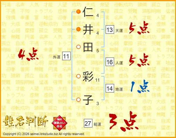 仁(4画)井(4画)田(5画) 彩(11画)子(3画)