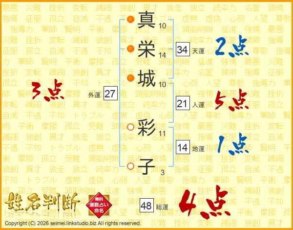 真(10画)栄(14画)城(10画) 彩(11画)子(3画)