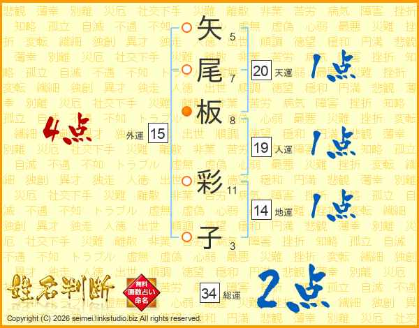 矢(5画)尾(7画)板(8画) 彩(11画)子(3画)