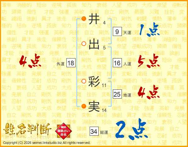 生活面を象徴する運勢です。外部から受ける影響力を表し、結婚運、家庭運や職場、環境への順応性を表します。総運から人運を引いた画数。姓や名が1文字の場合を除く。