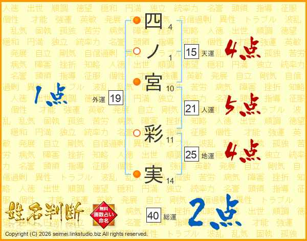 四(4画)ノ(1画)宮(10画) 彩(11画)実(14画)