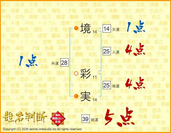 境(14画) 彩(11画)実(14画)