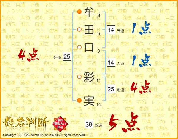 牟(6画)田(5画)口(3画) 彩(11画)実(14画)