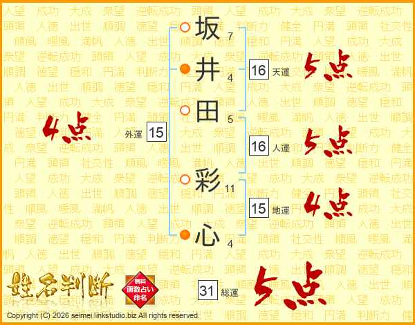 坂(7画)井(4画)田(5画) 彩(11画)心(4画)