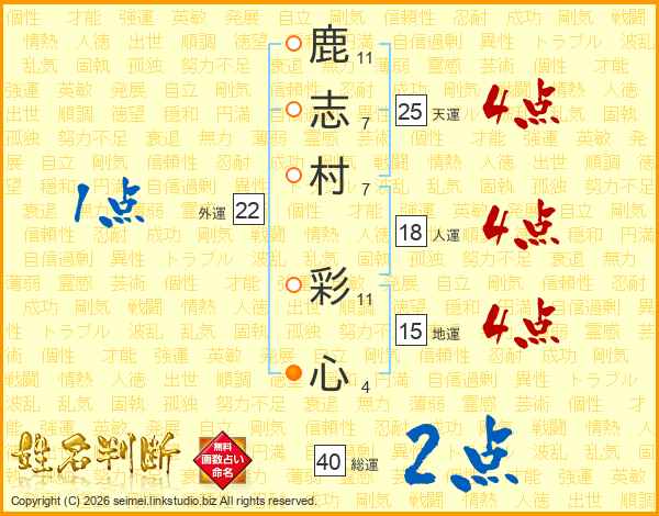 鹿(11画)志(7画)村(7画) 彩(11画)心(4画)