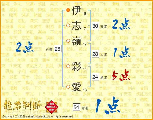 伊(6画)志(7画)嶺(17画) 彩(11画)愛(13画)
