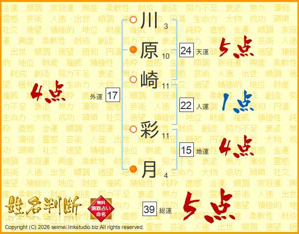 川(3画)原(10画)崎(11画) 彩(11画)月(4画)