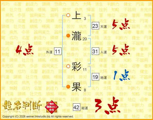 上瀧彩果さんの天運は23画の5点!