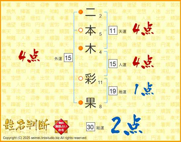 生活面を象徴する運勢です。外部から受ける影響力を表し、結婚運、家庭運や職場、環境への順応性を表します。総運から人運を引いた画数。姓や名が1文字の場合を除く。
