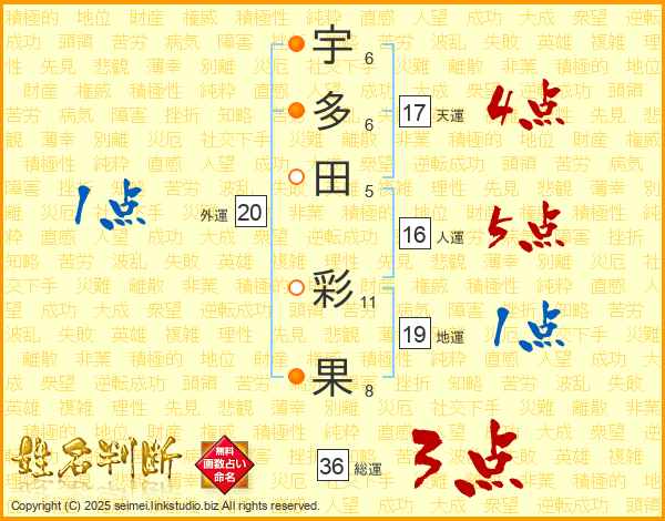 宇(6画)多(6画)田(5画) 彩(11画)果(8画)