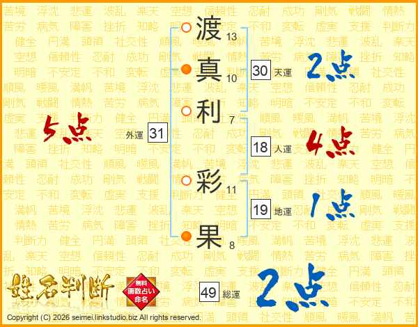 渡(13画)真(10画)利(7画) 彩(11画)果(8画)