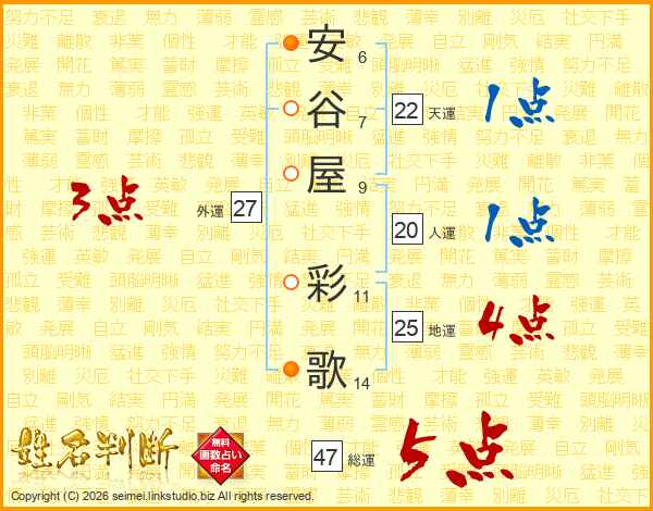 安(6画)谷(7画)屋(9画) 彩(11画)歌(14画)