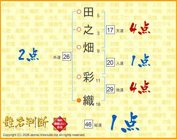 田(5画)之(3画)畑(9画) 彩(11画)織(18画)