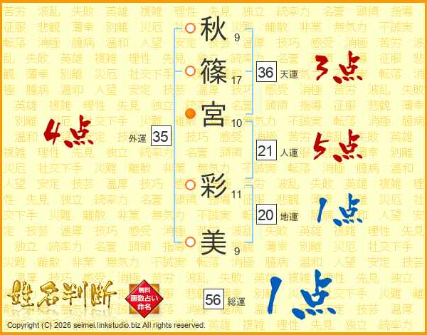 秋(9画)篠(17画)宮(10画) 彩(11画)美(9画)