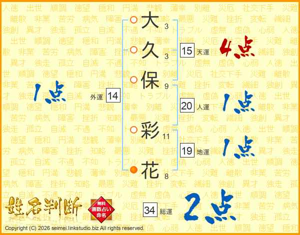 大(3画)久(3画)保(9画) 彩(11画)花(8画)