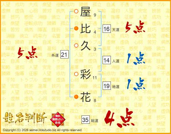 屋(9画)比(4画)久(3画) 彩(11画)花(8画)