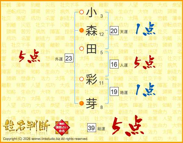 小(3画)森(12画)田(5画) 彩(11画)芽(8画)