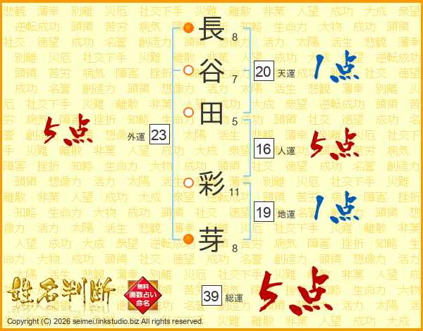 長(8画)谷(7画)田(5画) 彩(11画)芽(8画)