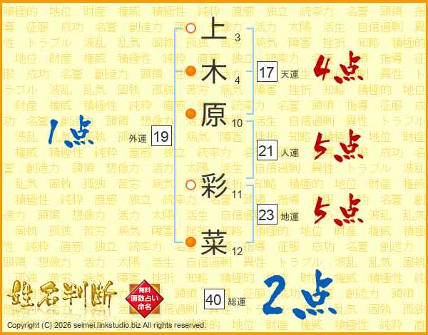 上(3画)木(4画)原(10画) 彩(11画)菜(12画)