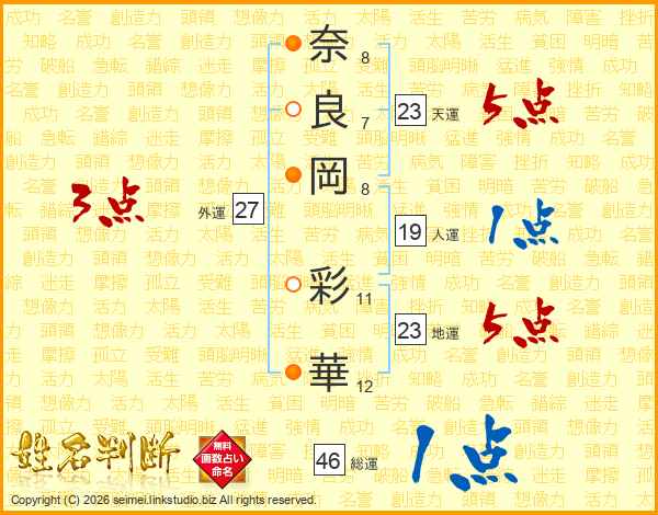 奈(8画)良(7画)岡(8画) 彩(11画)華(12画)