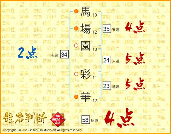 馬場園彩華さんの総運は58画の4点!
