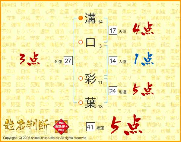 溝(14画)口(3画) 彩(11画)葉(13画)