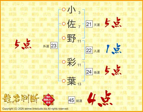 小(3画)佐(7画)野(11画) 彩(11画)葉(13画)