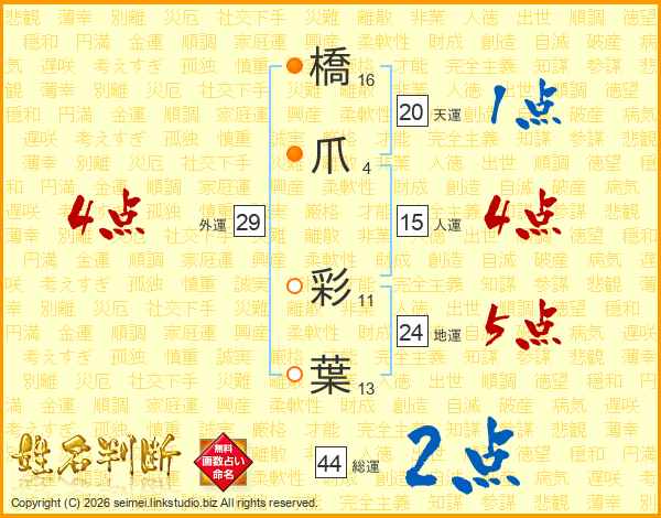 橋爪彩葉さんの総運は44画の2点!