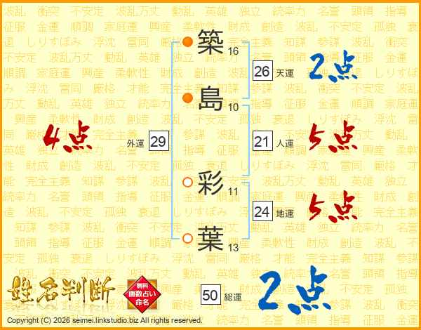 築(16画)島(10画) 彩(11画)葉(13画)