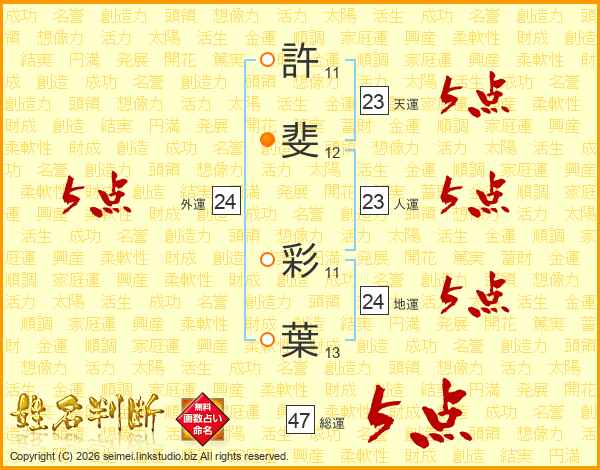 許(11画)斐(12画) 彩(11画)葉(13画)