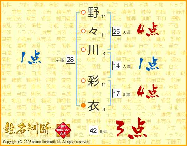 生活面を象徴する運勢です。外部から受ける影響力を表し、結婚運、家庭運や職場、環境への順応性を表します。総運から人運を引いた画数。姓や名が1文字の場合を除く。