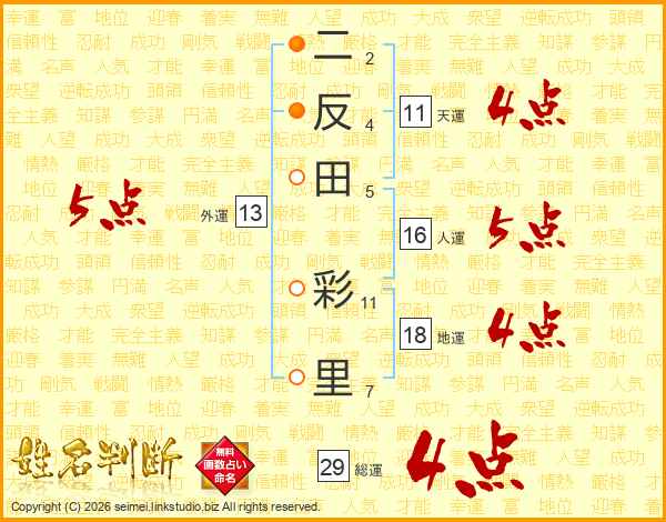 生活面を象徴する運勢です。外部から受ける影響力を表し、結婚運、家庭運や職場、環境への順応性を表します。総運から人運を引いた画数。姓や名が1文字の場合を除く。