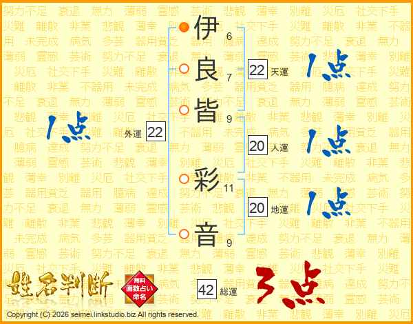 伊(6画)良(7画)皆(9画) 彩(11画)音(9画)