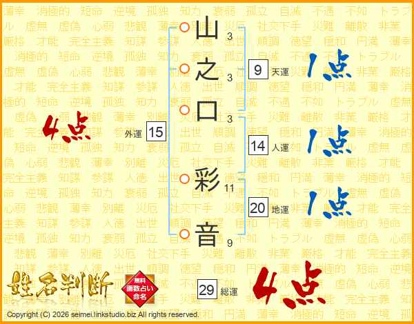 山(3画)之(3画)口(3画) 彩(11画)音(9画)